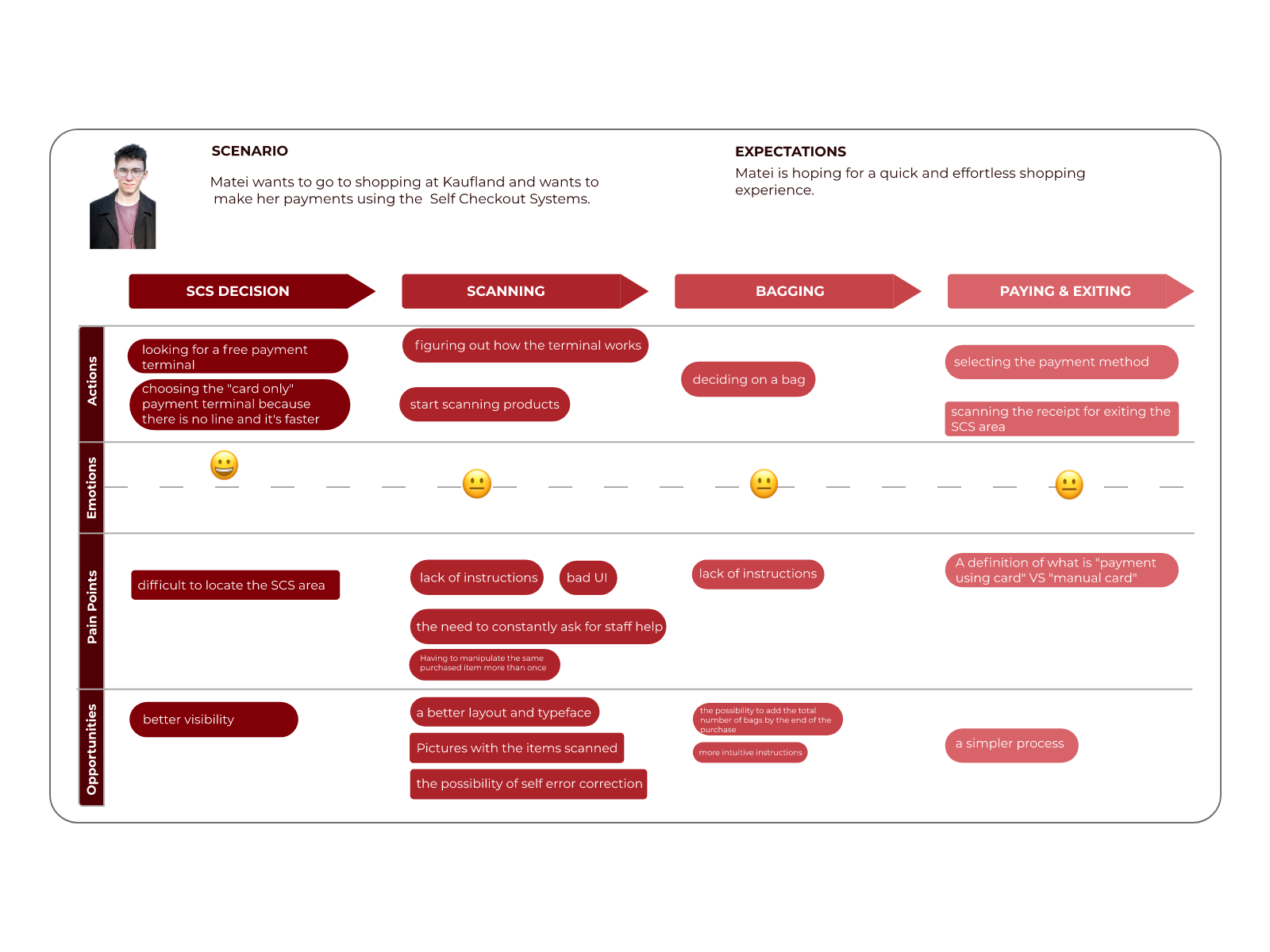 User personas helped us find the answer to one of our most important questions, “Who are we designing this self-checkout system for?”. By understanding the expectations, concerns, and motivations of our target users, we had the possibility to design a product that would satisfy the users’ needs and therefore be successful.
