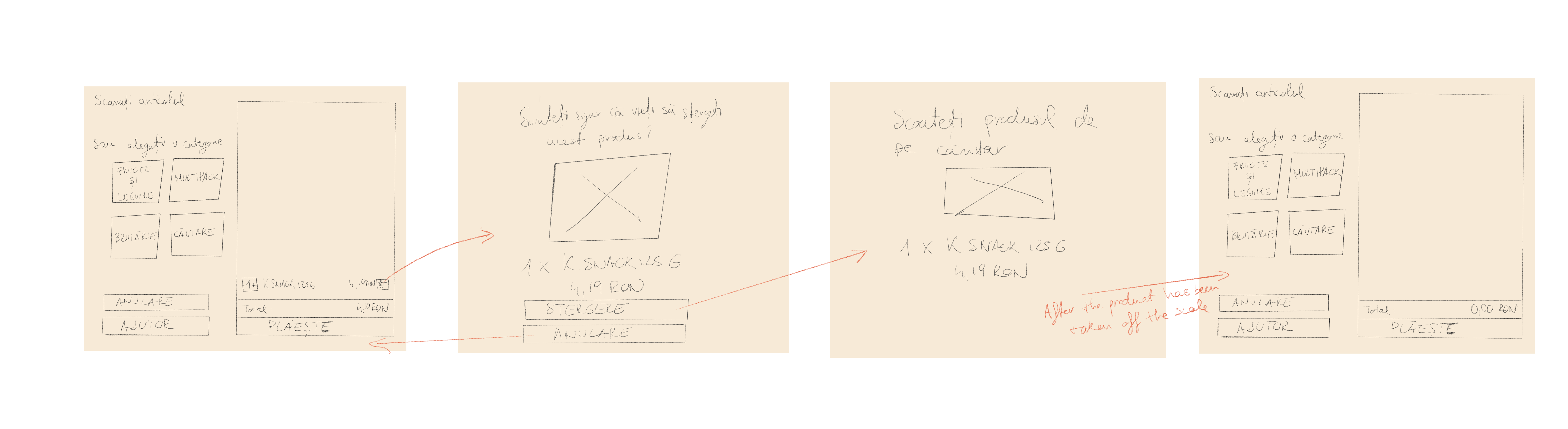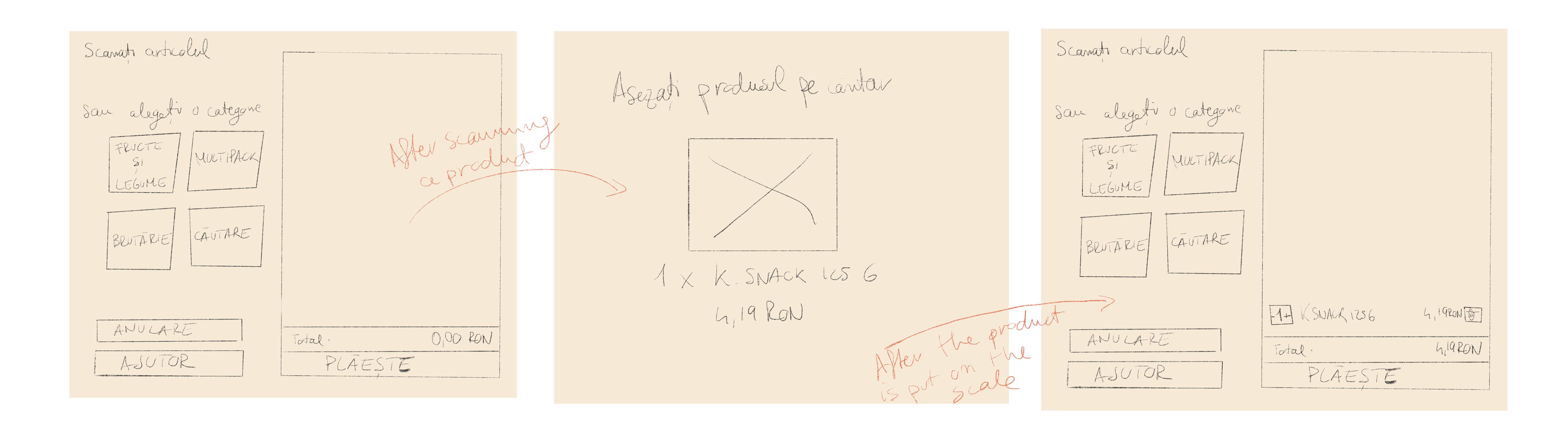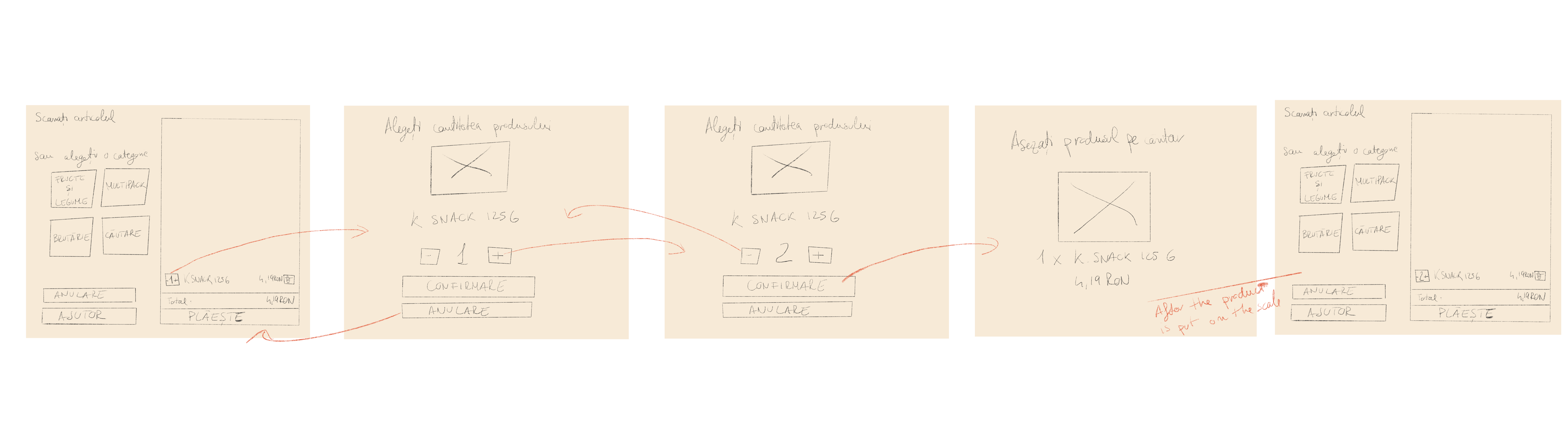 Two of the user needs they told us about were "being able to choose how many products of the same type they had" and the appearance of "an image of the product that has just been scanned". The solutions to these problems were given by the users themselves. I also took into account Kaufland's policy that after scanning the products, the users must place them on the scale.